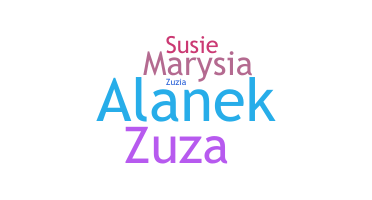 Populārākie Zuzia segvārdi - Zuza, Alanek, Marysia, Susie, Zuzia, Suzi. Izvēlieties nosaukumu spēlēm, sociālajam tīklam un zīmoliem no mūsu saraksta vai iesniedziet savu segvārdu.